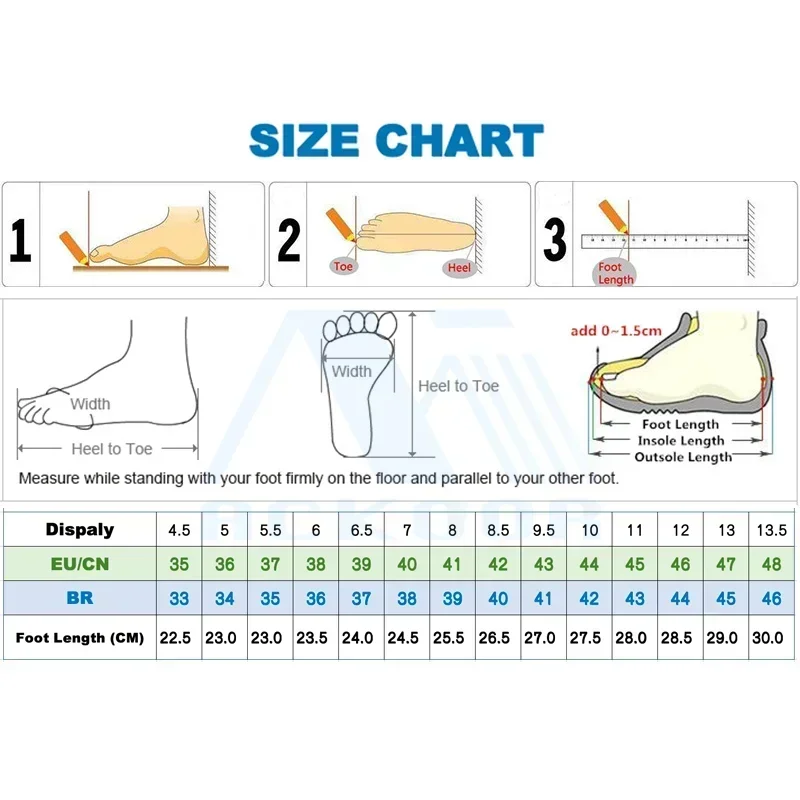 1. Please allow 1-1.5 error due to the Manual Measurement;2.Please choose the size only according to your foot length;3. lf your feet is wide or thick, we suggest you choose one size large