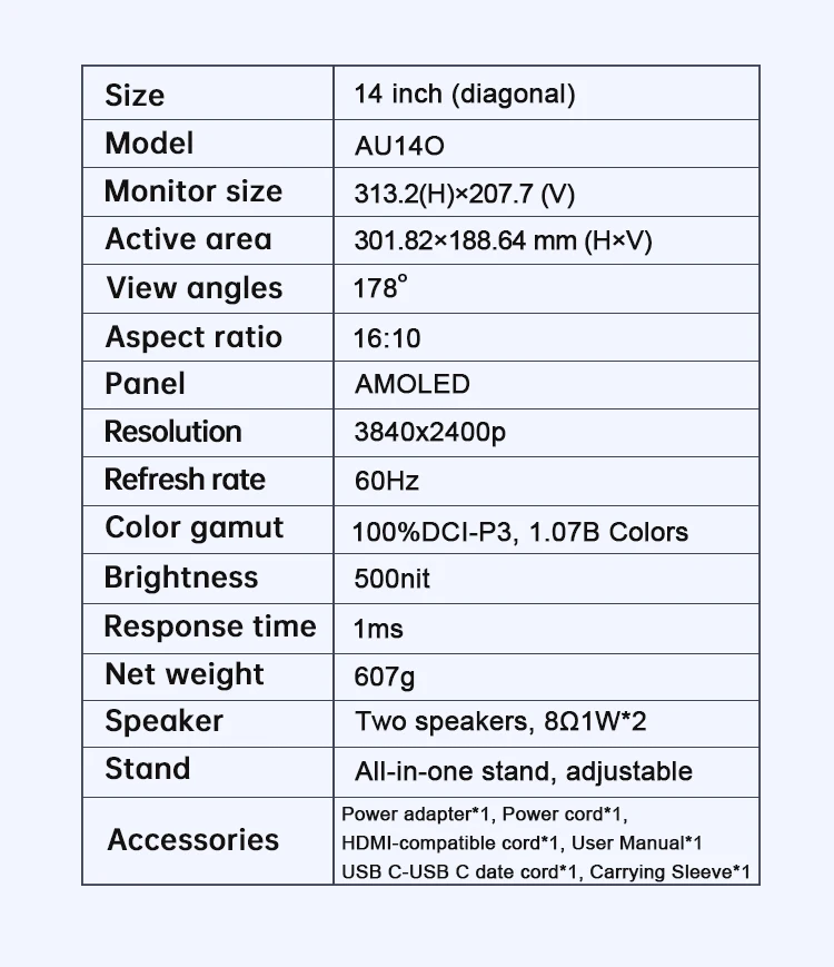 – Item: 14 inch 4K AMOLED UHD Portable Monitor