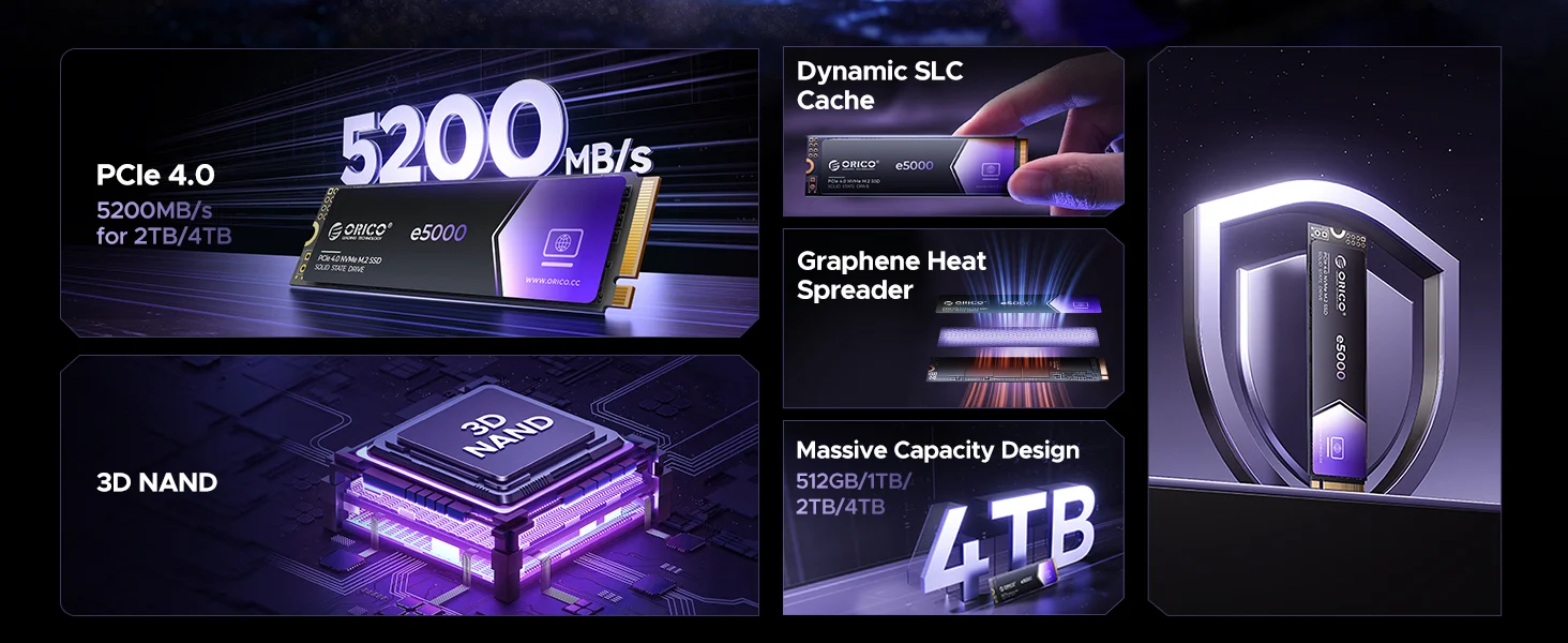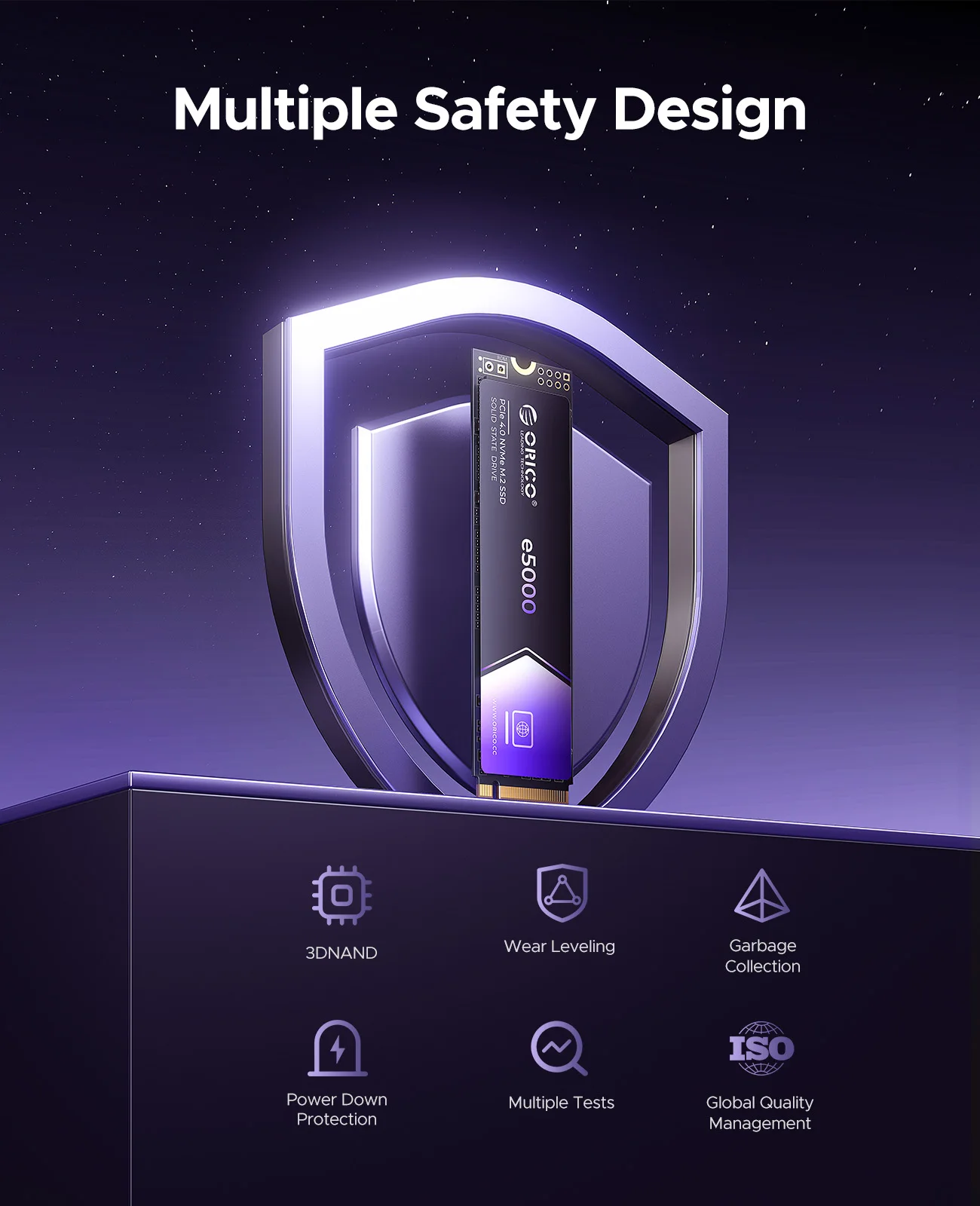 The ORICO e5000 M.2 SSD leverages the latest PCIe 4.0 interface to deliver blazing-fast performance with read speeds up to 5200MB/s. Enjoy instant program launches, rapid file transfers, and seamless multitasking with exceptional speed and efficiency.