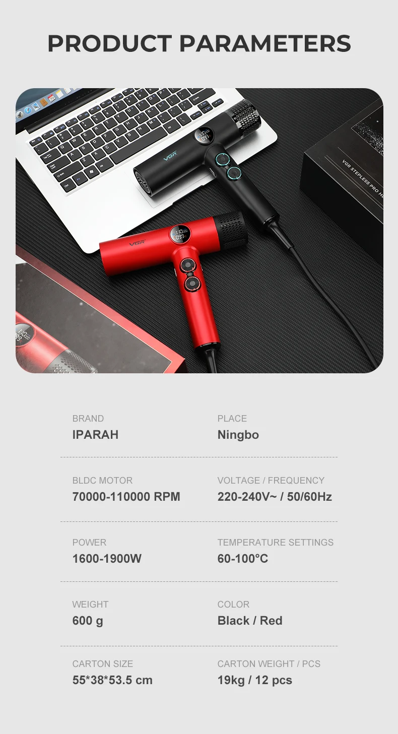 Brushless Motor :Equipped with a brushless motor, the V-401 hair dryer offers longer lifespan, reduced noise, and higher efficiency, making it a reliable choice for frequent use.